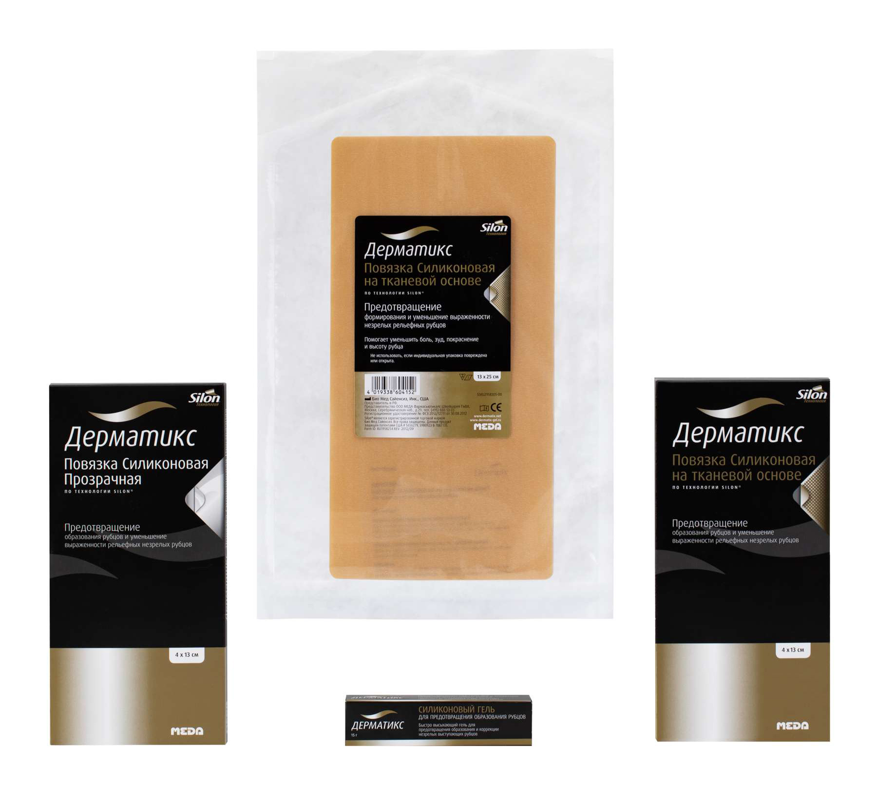Дерматикс — силиконовый гель для предотвращения образования рубцов непосредственно после заживления раны и коррекции незрелых выступающих рубцов (в тубах из термопласта по 6, 15, 60 г).