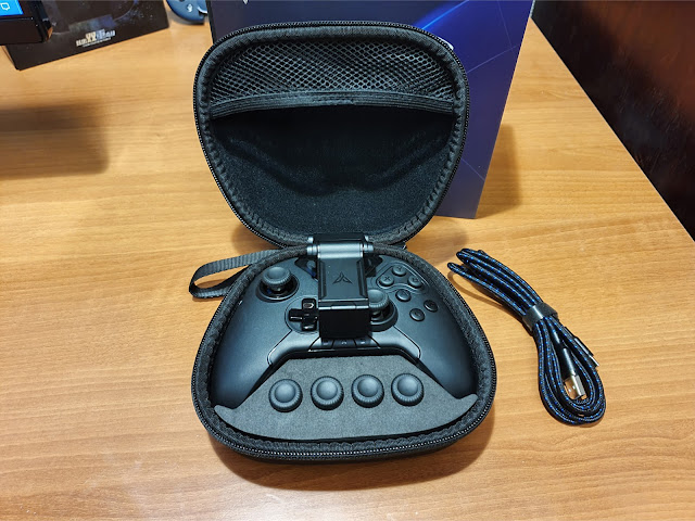 Кейс закрывается на молнию, внутри находится геймпад, четыре дополнительных сменных стика и сетчатое отделение в крышке, для хранения кабеля: