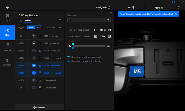 Приложение позволяет переназначать кнопки, записывать макросы, корректировать кривую для стиков и настраивать подсветку. Для программирования доступно четыре встроенных профиля: