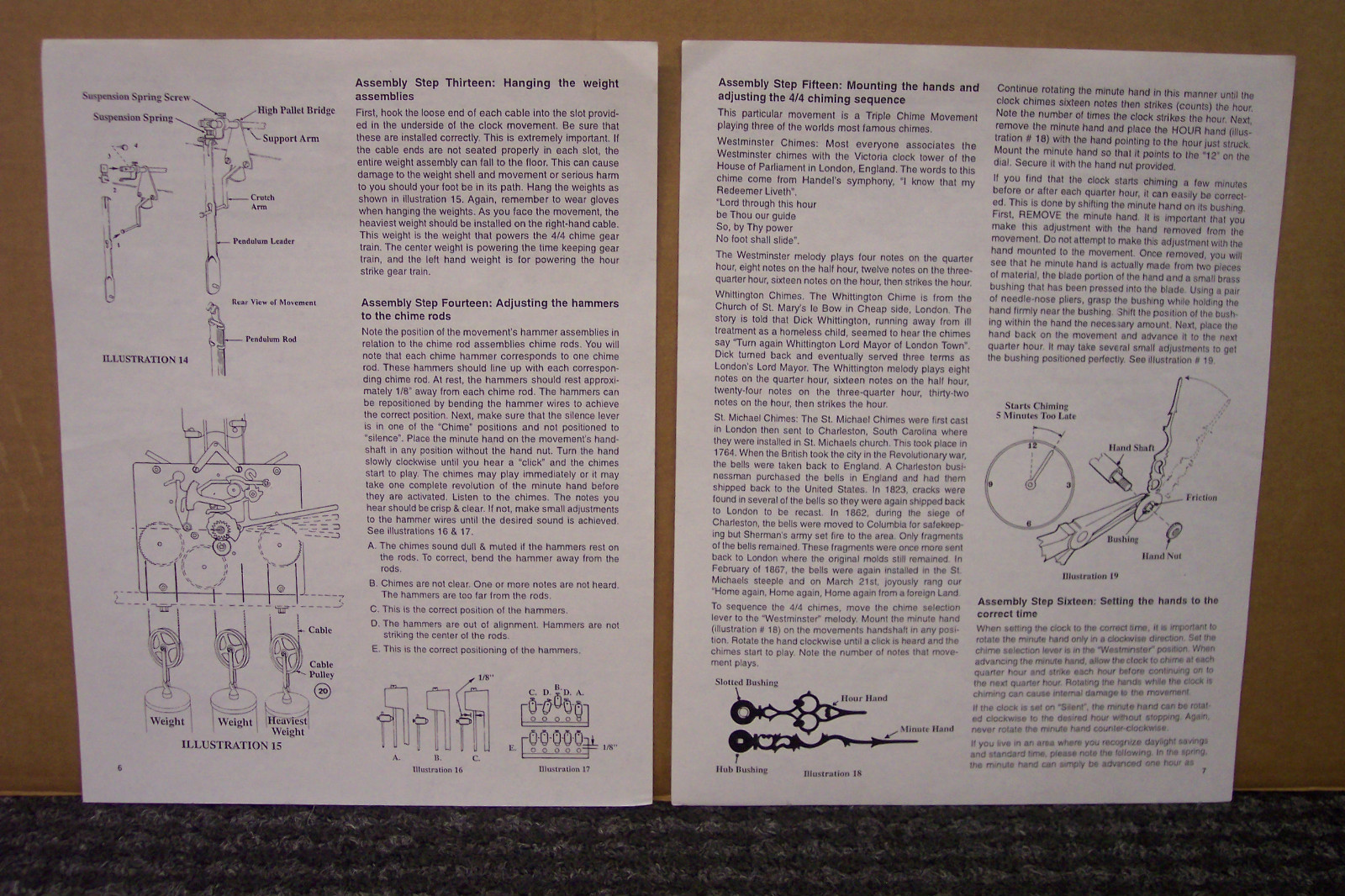 DO NOT MOVE THE HOUR HAND WHEN SETTING THE TIME. This hand will move automatically when the minute hand is moved. By moving the minute hand counterclockwise it is not necessary to wait for the clock to chime as the minute hand passes each quarter hour. The movement has a self correcting feature which synchronizes the chimes with the time. If after setting the clock on time, it does not chime properly, permit it to operate 2 hours to correct itself.