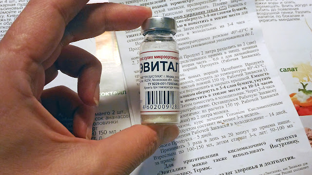 С йогуртницей идет небольшая книжка рецептов, однако я пока пользуюсь инструкцией к закваске, которую купила в аптеке, — «Эвиталия» (в одной аптеке флакон стоил 100 руб., в другой — 83).