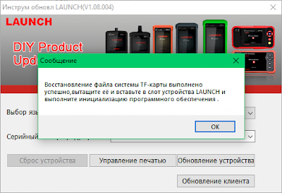 После успешной операции восстановления SD карты можно перейти к Обновлению. |