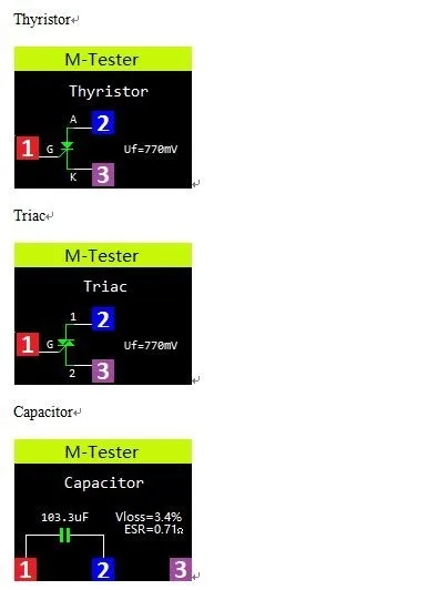 В инструкции к прибору говорится, что тестер способен тестировать тиристоры и симисторы с током управляющего электрода до 6 mA, но у MAC97A8 этот параметр равен 7 mA, а у BT134600E — 25 mA. Выходит или в инструкции ошибка или прибор лучше). С конденсаторами такая же история – до 100 mF. Микро или мили? Учитывая, что тестер измеряет конденсаторы емкостью больше 100 мкФ, то тогда в инструкции имеются в виду миллиФарады, а это 100 000 микроФарад. Но вернемся к тестированию.