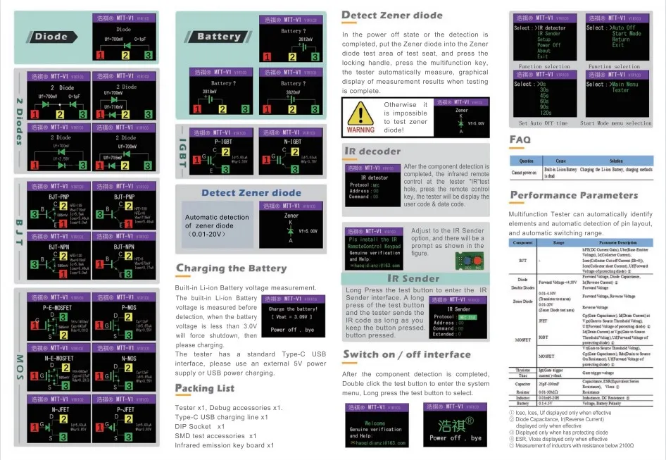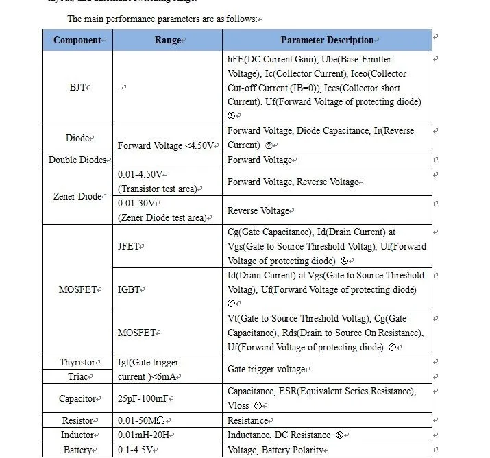 Характеристика:Самопроверка с автоматической калибровкойРазмер: 70*90*26 м/2,71×3,58×1,10 дюймовДисплей: TFT экран, цветной экранДиод диапазон: менее чем 4,5 VЗенеровский диод: транзистор обнаружить область: 0,01-4,5 VЗенеровский диод обнаружить область: 0,01-30 вДиапазон триака: IGT менее 6 мАЕмкость: 25pF-100mFРезистор: 0,01-50MΩИндуктивности: 0,01 mH-20 чМощность Напряжение: 3,7 VМощность: Встроенная перезаряжаемая литиевая батареяРезультаты измерений с использованием графического tft-дисплея (160×128)Управление одной кнопкойАвтоматическое выключение (Настройка таймаута)Встроенный литий-ионный аккумулятор высокой емкостиОбнаружение напряжения литий-ионного аккумулятораПоддержка китайского и английского языковПредупреждение: встроенный литий-ионный аккумулятор, строго запрещено погружать тестер в воду или рядом с источником тепла!Предупреждение: для вашей личной безопасности, пожалуйста, строго соблюдайте спецификации и меры предосторожности для использования литий-ионных батарей!Обнаружение транзисторов:После завершения режима выключения или тестирования поместите тестовый компонент в тестовую зону транзистора тестового гнезда, нажмите на ручку блокировки, нажмите многофункциональную клавишу, тестер автоматически измеряет, и результат измерения отображается в конце теста.Предупреждение: всегда разряжайте конденсатор перед подключением к тестеру! Тестер может быть поврежден перед включением!Предупреждение: мы не рекомендуем использовать тестер для измерения батареи! Напряжение батареи разного освещения должно быть менее 4,5 V, в противном случае, прибор для проверки может быть повреждена!Размещение компонентов:Тестовое гнездо делится на транзисторы и зоны тестирования диодов Зенера, как описано в 1,1.Примечание: Не выполняйте другие операции во время процесса калибровки, чтобы не повлиять на точность калибровки!Упаковочный лист:1 х Многофункциональный тестер транзисторов TFT1 x Группа электронных компонентов (отправлено случайным образом)3 x Тест-крюкКороткий три тестовых гнезда, нажмите многофункциональную кнопку в ближайшее время, и тестер автоматически откалибрует.Другие операции не требуются после отключения короткой проводки в соответствии с запросом во время процесса калибровки.