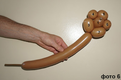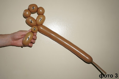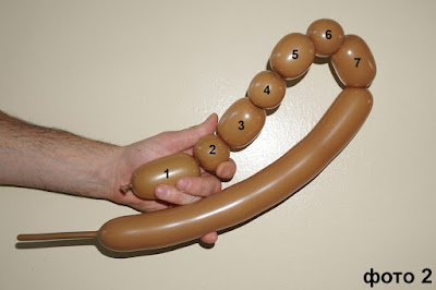 Делаем первый примерно 7 см пузырь. Делаем второй примерно 3 — 4 см пузырь. Делаем третий примерно 5 см пузырь. Делаем четвёртый примерно 2 — 3 см пузырь. Делаем пятый примерно 4 — 5 см пузырь. Делаем шестой (такого же размера как и четвёртый пузырь) примерно 2 — 3 см пузырь . Делаем седьмой (такого же размера как и третий пузырь) примерно 5 см пузырь (фото 2).