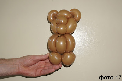 Замыкаем свободный конец тринадцатого пузыря между пузырями головы и пузырём тела (фото 16 — 18). Обрежьте остаток шарика и завяжите конец. Поздравляю! Мы сделали медвежонка из одного шарика.