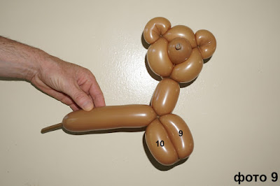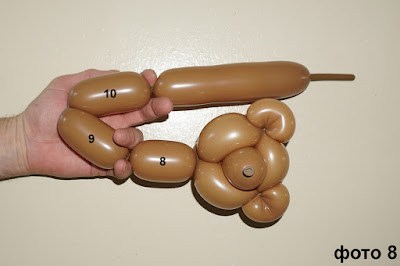 Делаем восьмой примерно 7 — 9 см пузырь. Это будет живот медведя. Зжимаем шарик чтобы сделать его мягким. Делаеа девятый и десятый примерно 9 — 12 см пузыри. Остаток шарика должен быть примерно втри раза длинее чем восьмой пузырь (фото 8).