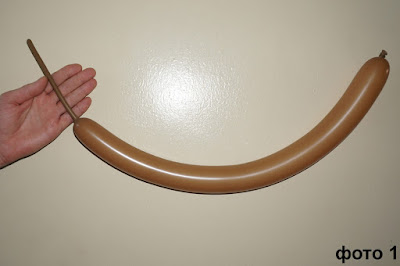 - Для изготовления носика надуваем коричневый ШДМ 160 дюймов, делаем из нее небольшой прямоугольный пузырек и связываем его хвостики вместе, излишки обрезаем;