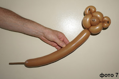 Замыкаем оба конца четвёртого пузыря в один замок. Первый пузырь должен оставаться внутри петли из последних пяти (третий по седьмой) пузырей. Замыкаем оба конца шестого пузыря (фото 7). Мы сделали голову медвежёнка.