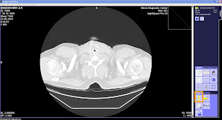 Наведите курсор на одну из осей или на перекрестье двух осей в одной из трех ячеек с изображениями КТ и зажмите левую клавишу мыши. Теперь перетаскивайте выбранную ось или перекрестье осей внутри ячейки и смотрите, как меняются изображения в двух других ячейках. Если изображение в одной или двух ячейках исчезло, значит курсор находится вне изображения в выбранной ячейке.