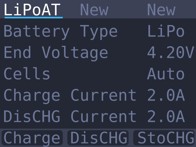Перед стартом процесса надо выбрать тип аккумулятора. Поддерживаются LiPo, LiHv, LiFe, Lion, NiMh, PB. Затем идет напряжение, до которого следует зарядить аккумулятор. Количество банок можно либо задать вручную, либо оставить в режиме автоматического определения. Чуть ниже задается ток заряда и, если необходимо, ток разряда.
