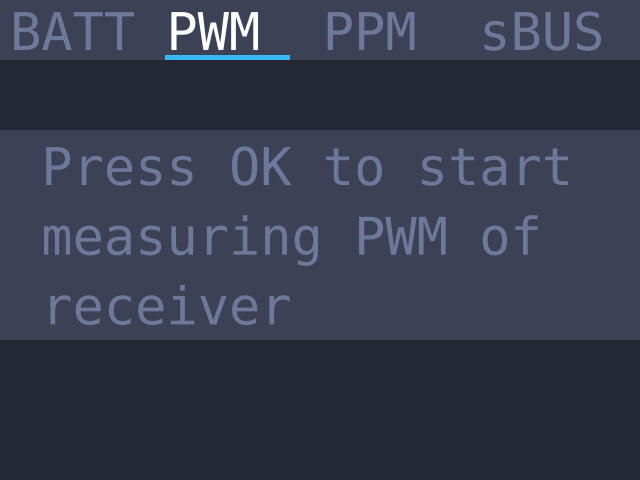 Следующий блок — раздел измерений. Сразу же попадаем на выбор того, что будем измерять: параметры аккумулятора, PWM-импульс, PPM-сигнал или sBUS.