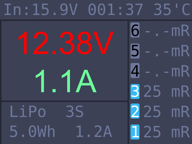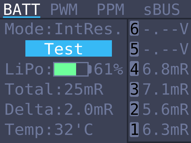 В режиме измерения внутреннего сопротивления, чтобы данные стали доступны, надо запустить тестирование аккумулятора. На экране будет доступно общее сопротивление и сопротивление каждой банки аккумулятора.