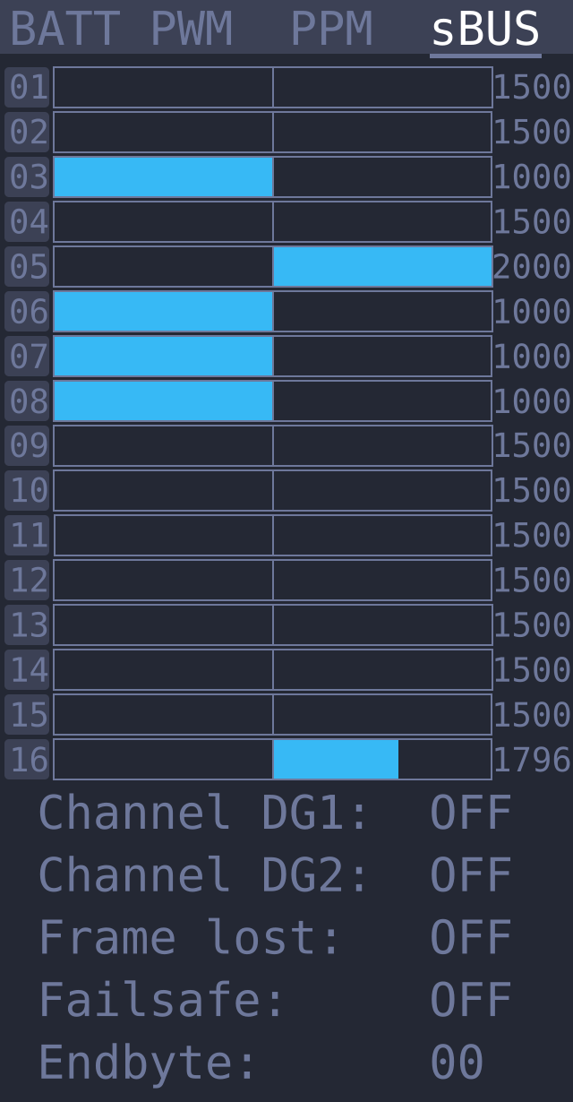 В sBUS-режиме можно посмотреть работу 16-ти каналов приемника. На вход прибора должен подаваться инвертированный сигнал, как у приемников FrSky. На пробу, подключил FrSky XM+. Показывает работу 15-ти каналов, а на 16-м видно уровень RSSI.