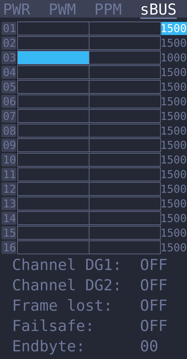 Заключительный пункт — генератор sBUS-сигнала. Даже не знаю, куда этот режим еще можно применить, кроме проверки работы полетного контроллера. Данные, как и в режиме sBUS-тестера, растянулись на три экрана. Можно изменять сигнал на каждом из 16-ти каналов в диапазоне 882-2160мкс.