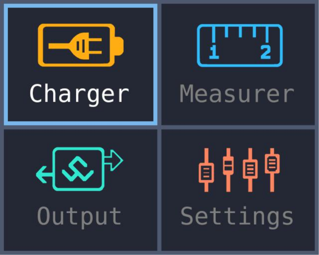 Теперь по функционалу. Основной экран разбит на четыре блока: зарядка, измерения, генератор и настройки. Перемещение между блоками осуществляется стрелками, вход в раздел — ввод.