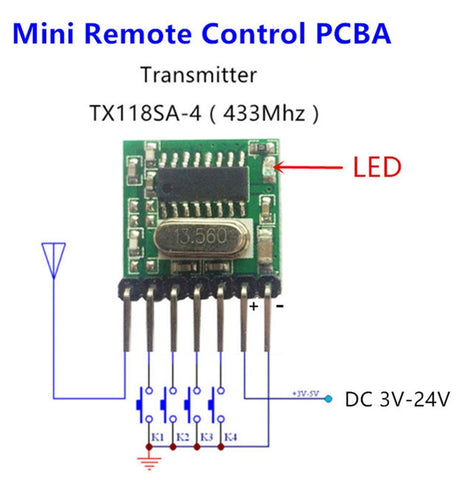 Модуль передачи шифрованного сигнала на частоте 433 мГц. Используется для дистанционного управления исполнительными устройствами, работающими на соответствующей частоте (шлагбаумы, гаражные ворота, устройства умного дома, радиореле). При замыкании входного контакта на массу, модуль отправляет соответствующий выходу сигнал. По аналогии с брелоками, модуль не требует настройки. Совмести со всеми устройствами 433 из нашего каталога и большинством приборов, управляемых аналогичной частотой и поддерживающих программирование дополнительных пультов. Передатчик TX-118 работает как обычный пульт дистанционного управления 433mHz.